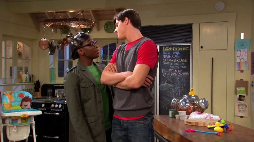 Meanwhile, Teddy finally arrives at Mrs. Dabney's house. Teddy says to Mrs. Dabney that she shouldn't have let him in, but she informs Teddy that Gabe crawled through the cat door. She tells Mrs. Dabney that she is sorry about the incident, and she wants Gabe to apologize. Instead, Gabe asks what Mrs. Dabney is fixing tomorrow, and she replies that it's the cat door to install a lock. As Teddy starts to go home, Gabe sits on Mrs. Dabney's porch. Teddy asks why, and Gabe questions whether she's suddenly interested in him. Gabe says he's jealous of Charlie for taking all the attention. He feels like a loser middle kid, like Teddy. Teddy says she was the youngest child once, and when Gabe arrived, she was jealous of him, but when Gabe peed on PJ, she learned to warm up to him. Teddy says even though the hottest guy in school is at the house, she's spending time with Gabe. Charlie suddenly pukes milk on Teddy, and Gabe laughs, saying that he's starting to warm up to Charlie already.